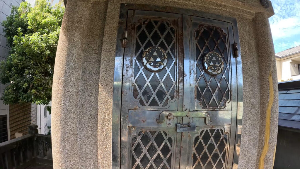 千度小路龍宮神社のお社の扉には、北条氏に認められていた証である、三ッ鱗の家紋に漁師達の功績を称えた波の模様が入っています。